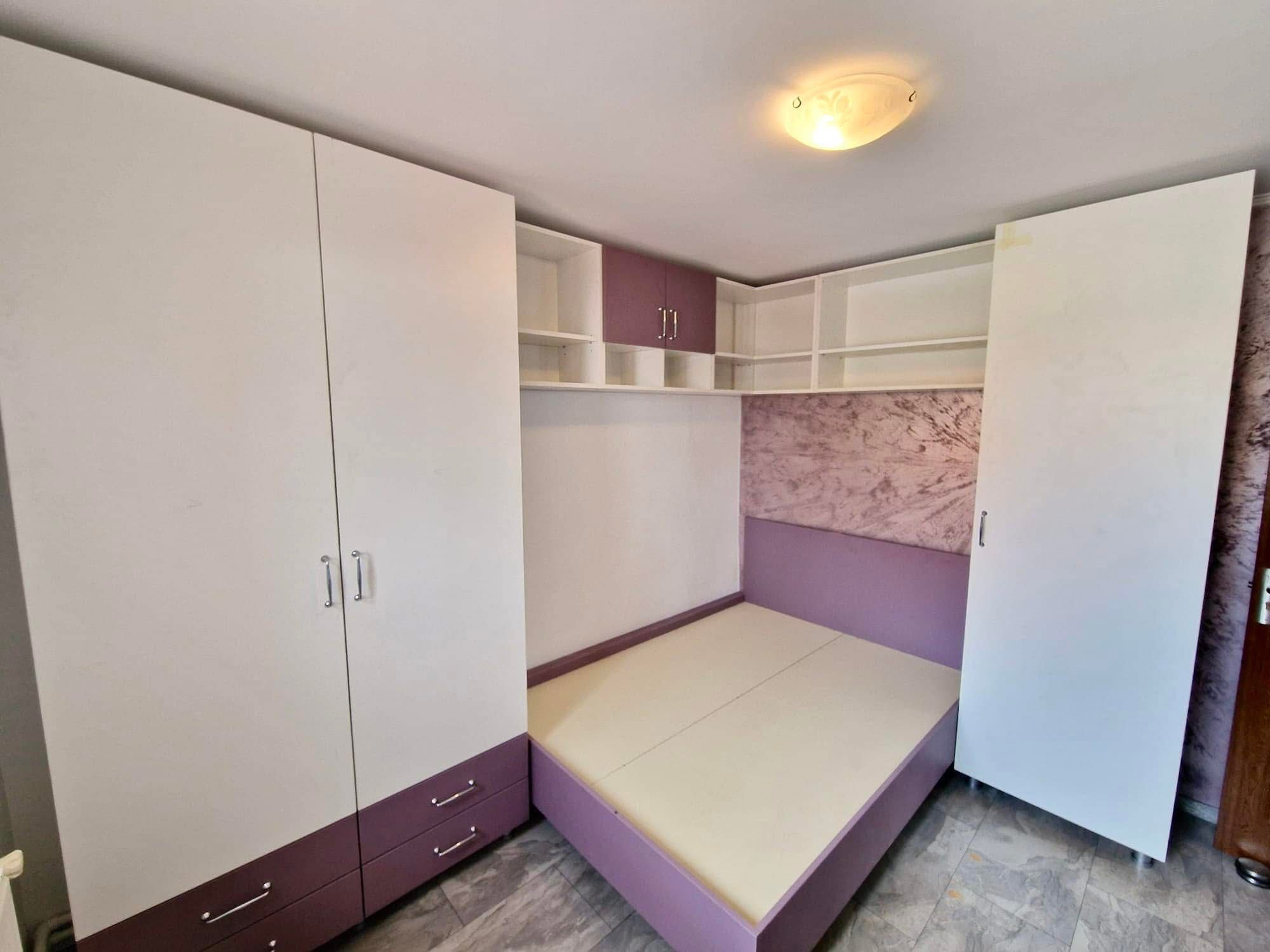 Acest dormitor complet este realizat integral din PAL melaminat de 18 mm, oferind rezistență, stabilitate și un aspect modern, potrivit pentru orice tip de locuință. Combinația cromatică dintre alb și accentele delicate de culoarea lavandei creează un ambient relaxant, ideal pentru odihnă și confort.